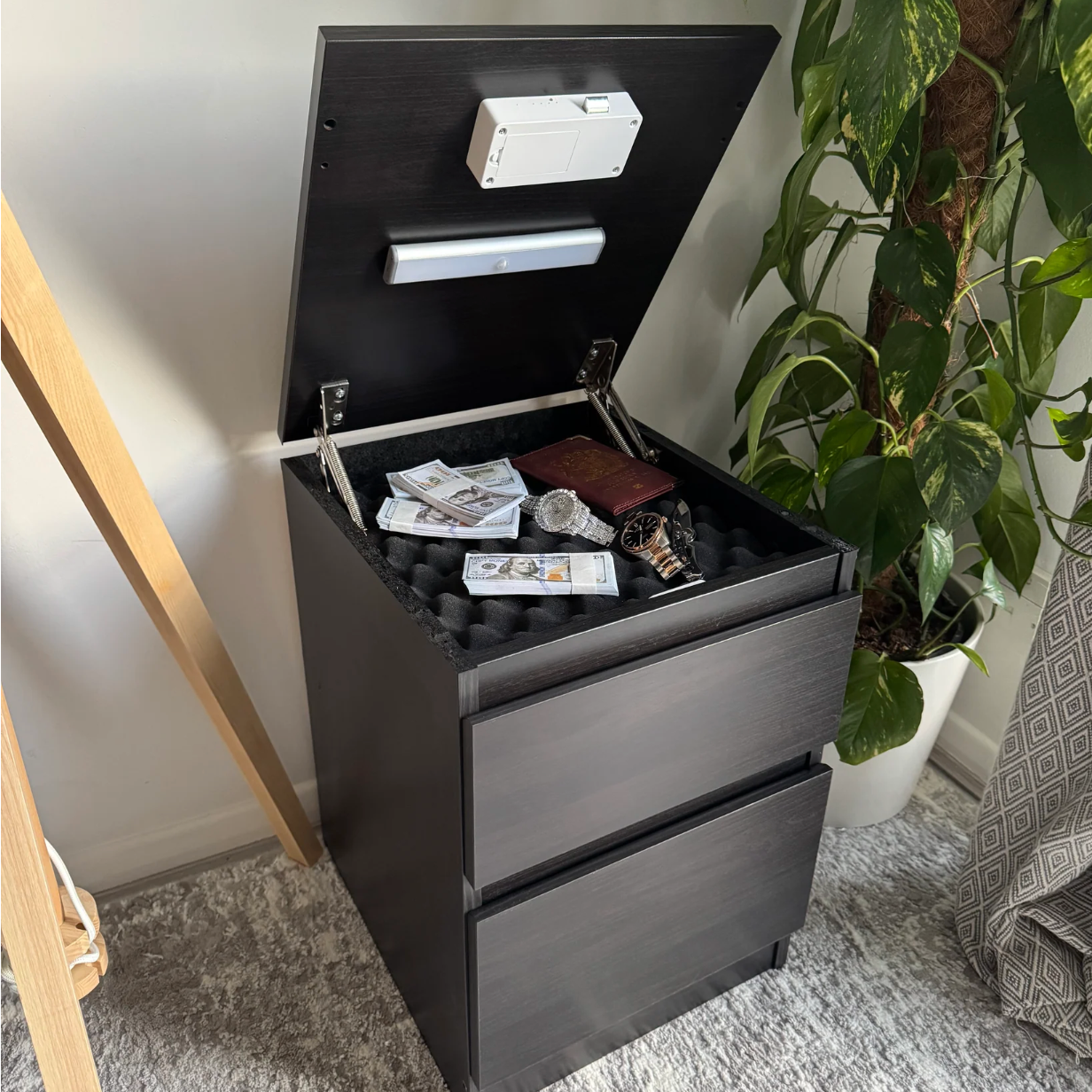 Modern tasarım, sessiz mekanizma ve ID kartlı güvenlik ile gizli bölmeli komodin. Evinize şıklık katarken eşyalarınızı gözlerden uzak tutun.